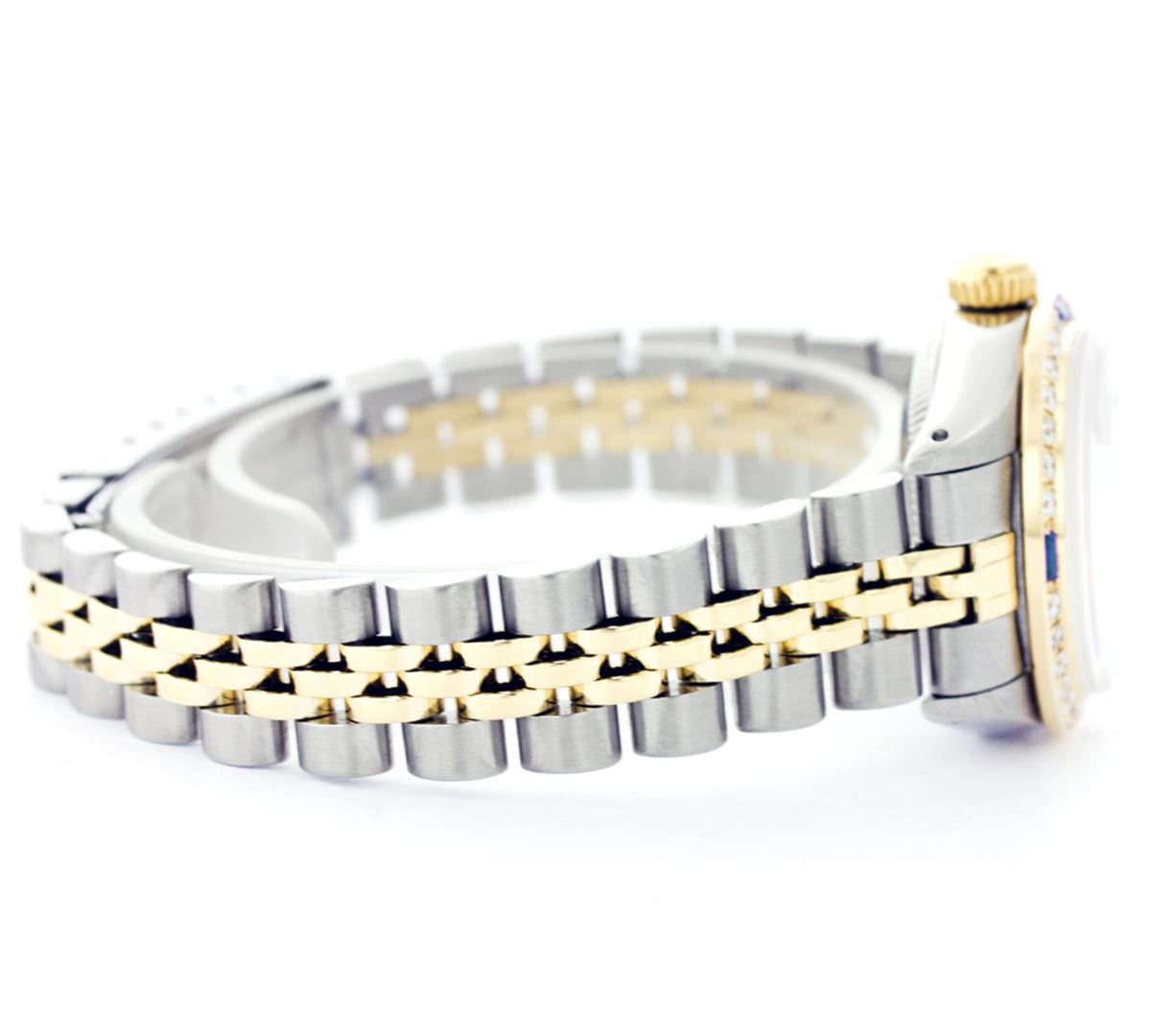 One Womens Two Tone Rolex Datejust Polished, Serviced & Electronically Tested, 14K Yellow Gold & Stainless Steel Case:26mm, 14K Yellow Gold Crown, Custom Bezel: 18K Yellow Gold Sapphire Beadset Diamond Bezel, Stone Count: 28 Diamonds + 4 Sapphires, Total Weight .70 Carat, Clarity: Si-VS, Color: G to H. Custom Crystal: Synthetic Sapphire Cyclops Lens. Movement: Automatic Winding Movement Caliber 2030. Custom Dial: Mother Of Pearl Diamond Dial With Small Tracks, Stone Count: 10 Diamonds in Dial. Date Window: 3 O'Clock Position Date Display, Non Quickset, Model: Datejust, Condition: G-6 Extra Fine. Bracelet:Two Tone 14K Yellow Gold & Stainless Steel Jubilee. Bright Polish. 5.5 Inch Length, Adjustable. Standard Clasp, With Rolex Logo.
