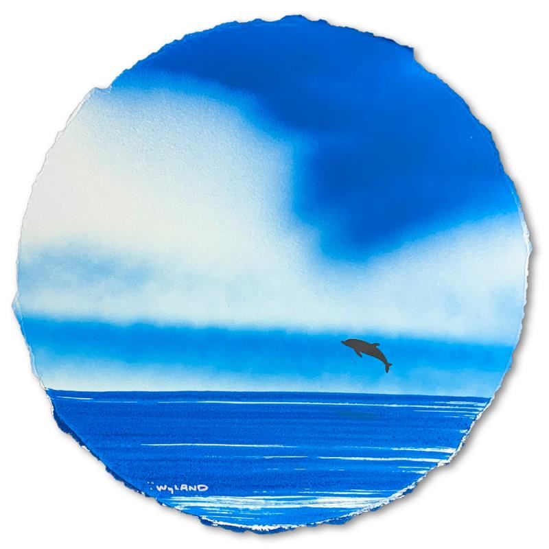 "Dolphins" is an original painting, watercolor on deckle edge paper by Wyland. Hand signed by the artist, the piece comes custom framed and with a letter of authenticity. Measures approximately 30" x 30" (framed), 19.5" x 19.5" (image).