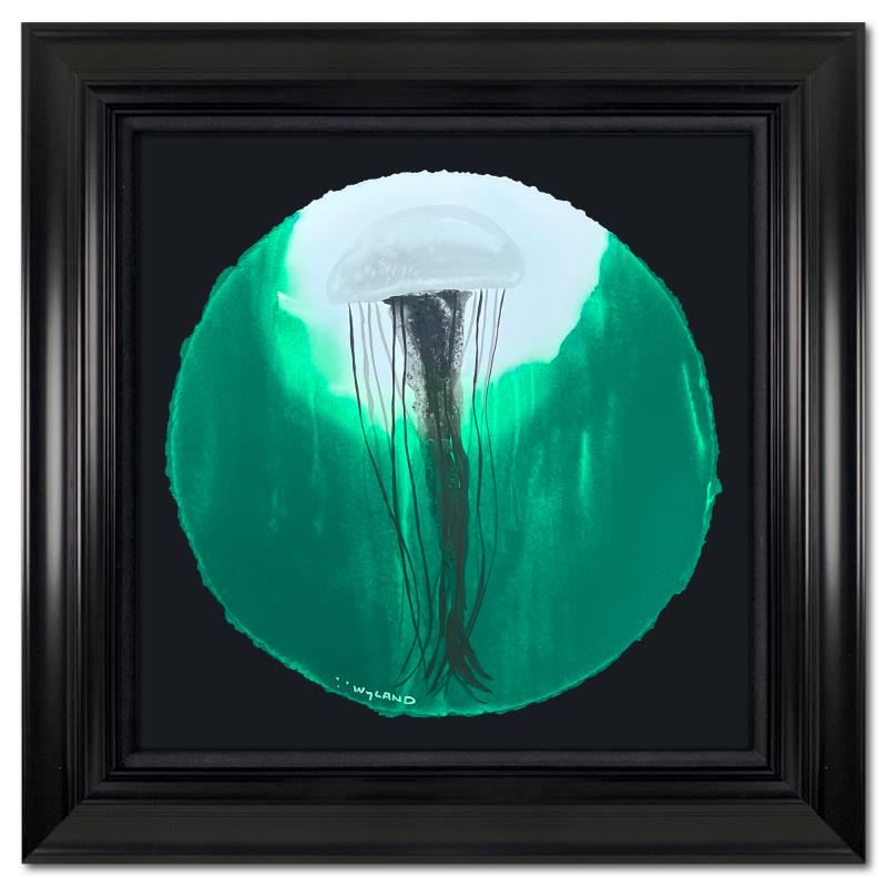 "Jellyfish in Green" is an original painting, watercolor on deckle edge paper by Wyland. Hand signed by the artist, the piece comes custom framed and with a letter of authenticity. Measures approximately 30" x 30" (framed), 19.5" x 19.5" (image).