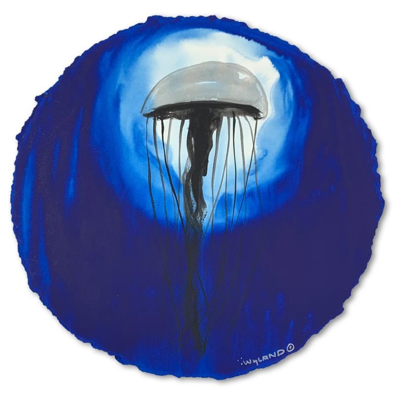 "Weightless Jellyfish" is an original painting, watercolor on deckle edge paper by Wyland. Hand signed by the artist, the piece comes custom framed and with a letter of authenticity. Measures approximately 30" x 30" (framed), 19.5" x 19.5" (image).