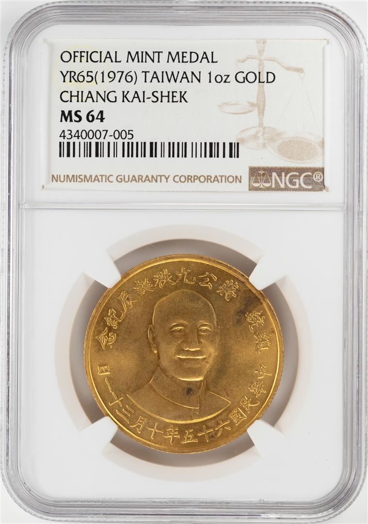 One YR65 (1976) Taiwan Chaing Kai-Shek 1 oz. Gold Mint Medal NGC MS64. NGC Certified.