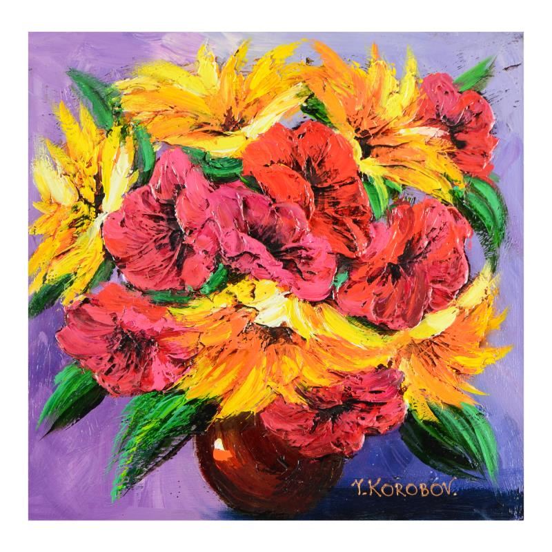 Summer Symphony is an original acrylic painting on canvas by Yana Korobov, hand signed by the artist. Includes Letter of Authenticity. Measures approx. 20" x 20" (image).