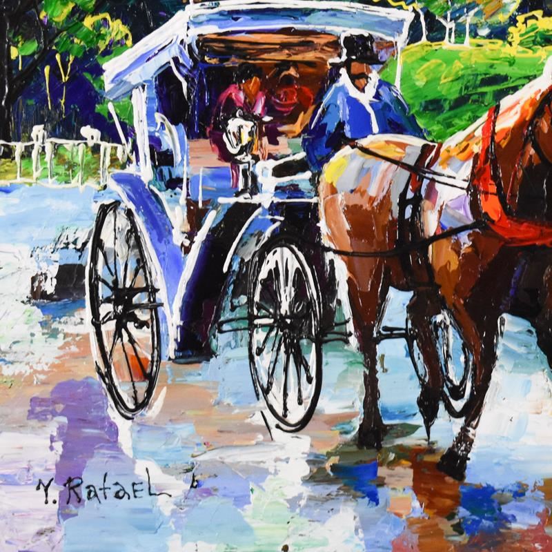 "Carriage Ride" is an original painting, acrylic on stretched canvas, by Yana Rafael. Hand signed by the artist, this piece is accompanied by certificate of authenticity and measures approximately 36" x 24".