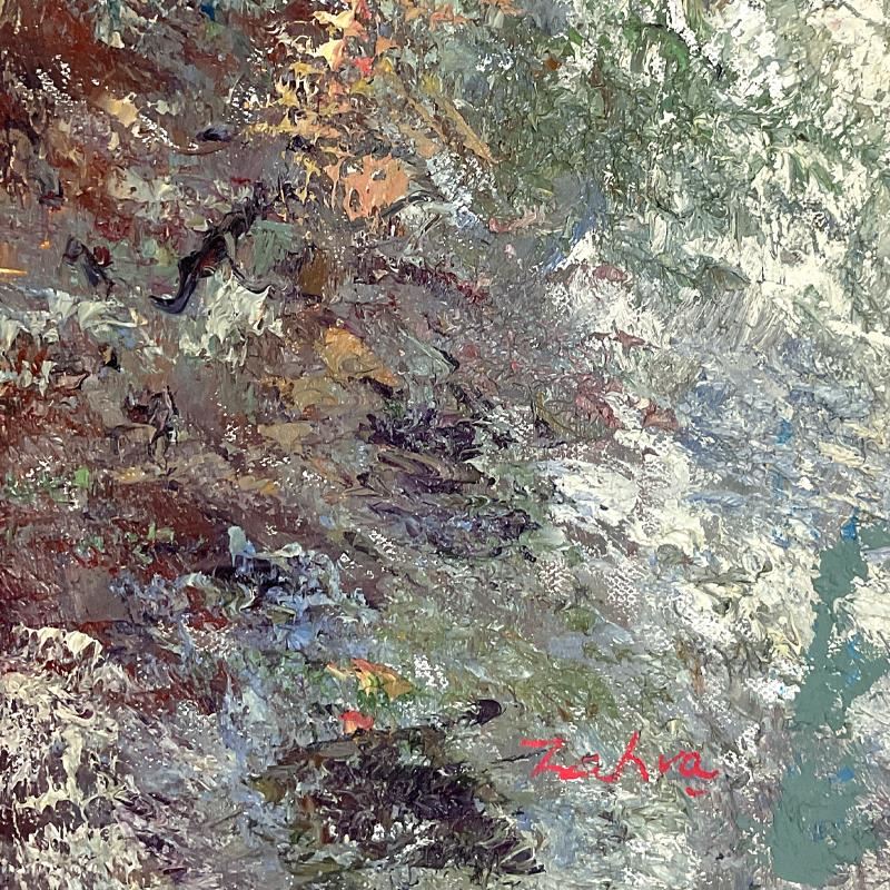 This is an original oil painting on canvas by Zahra, hand signed by the artist. Includes Letter of Authenticity. Measures approx. 44" x 44" (image).