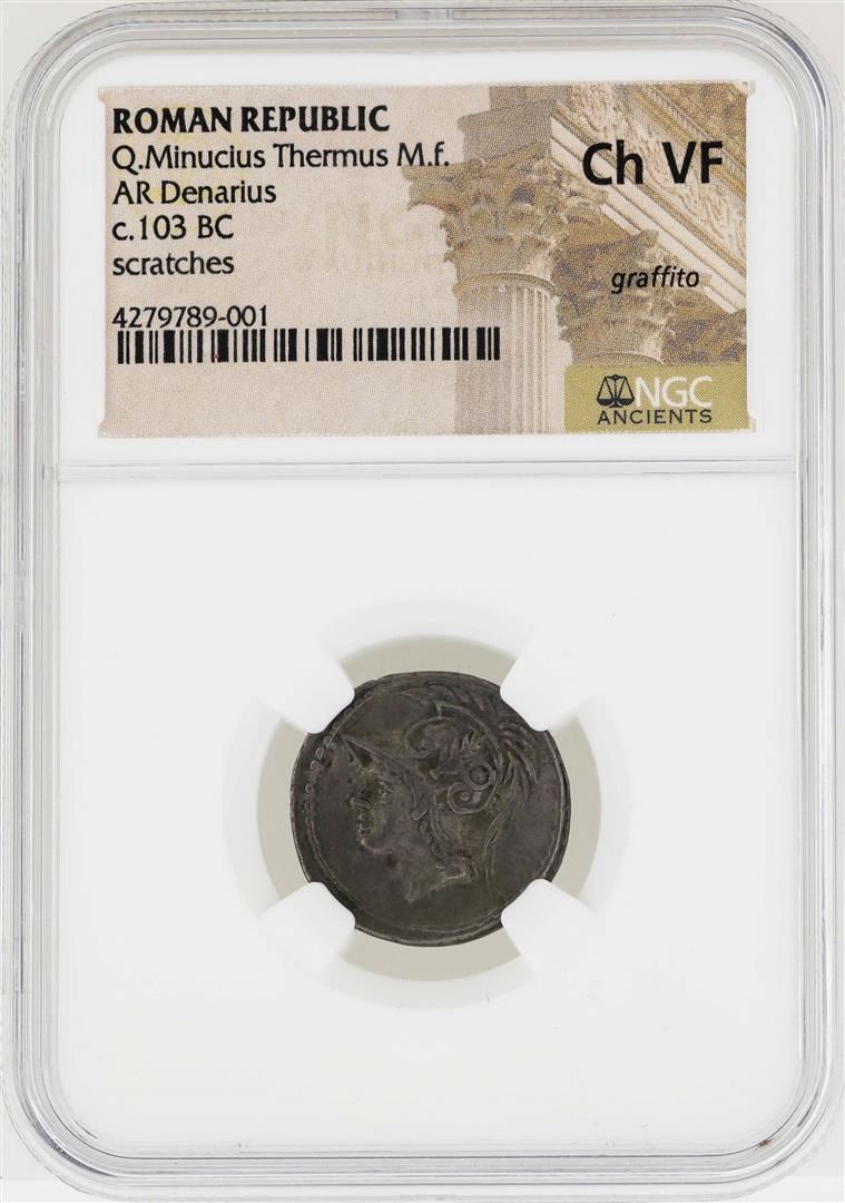 One c.103 Roman Republic Q. Minucius Thermus M.f. Ancient Coin NGC CH VF. NGC Certified.