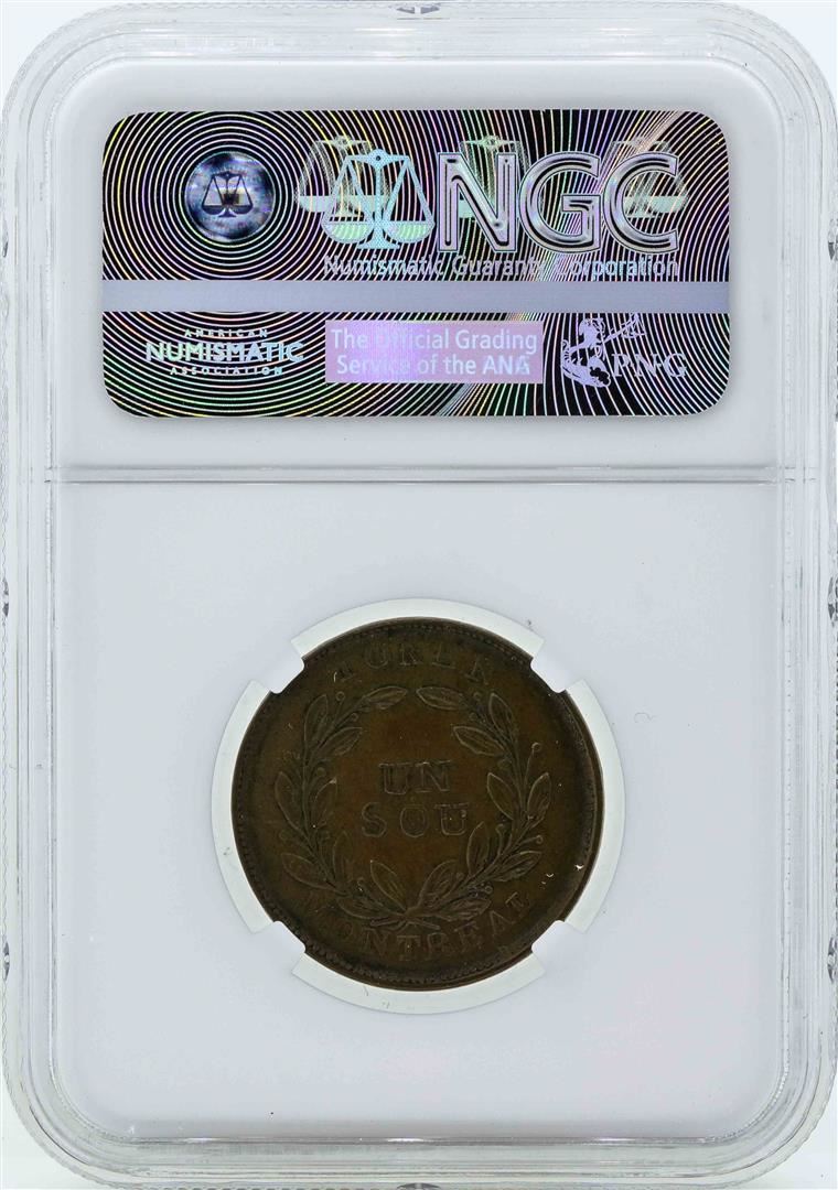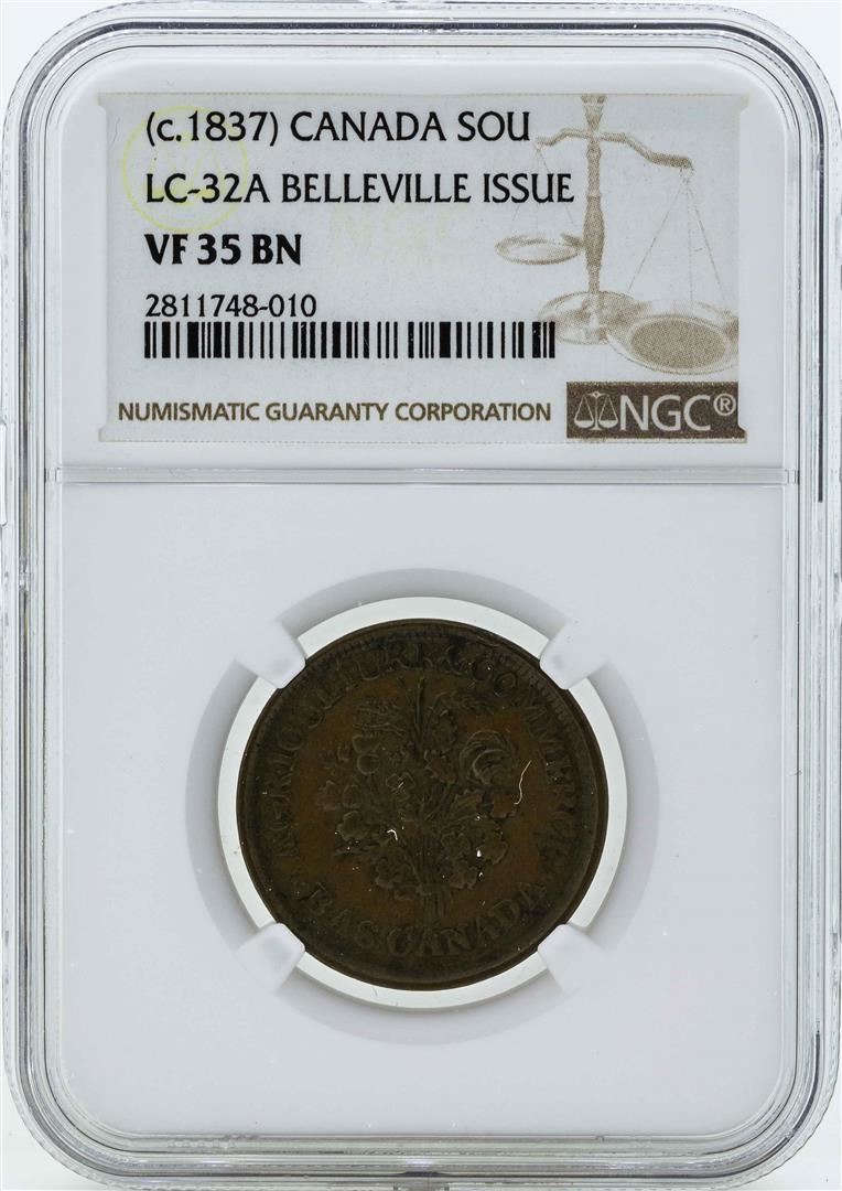 One c. 1837 Canada Un Sou LC-32A Belleville Issue Coin NGC VF35BN. NGC Certified.