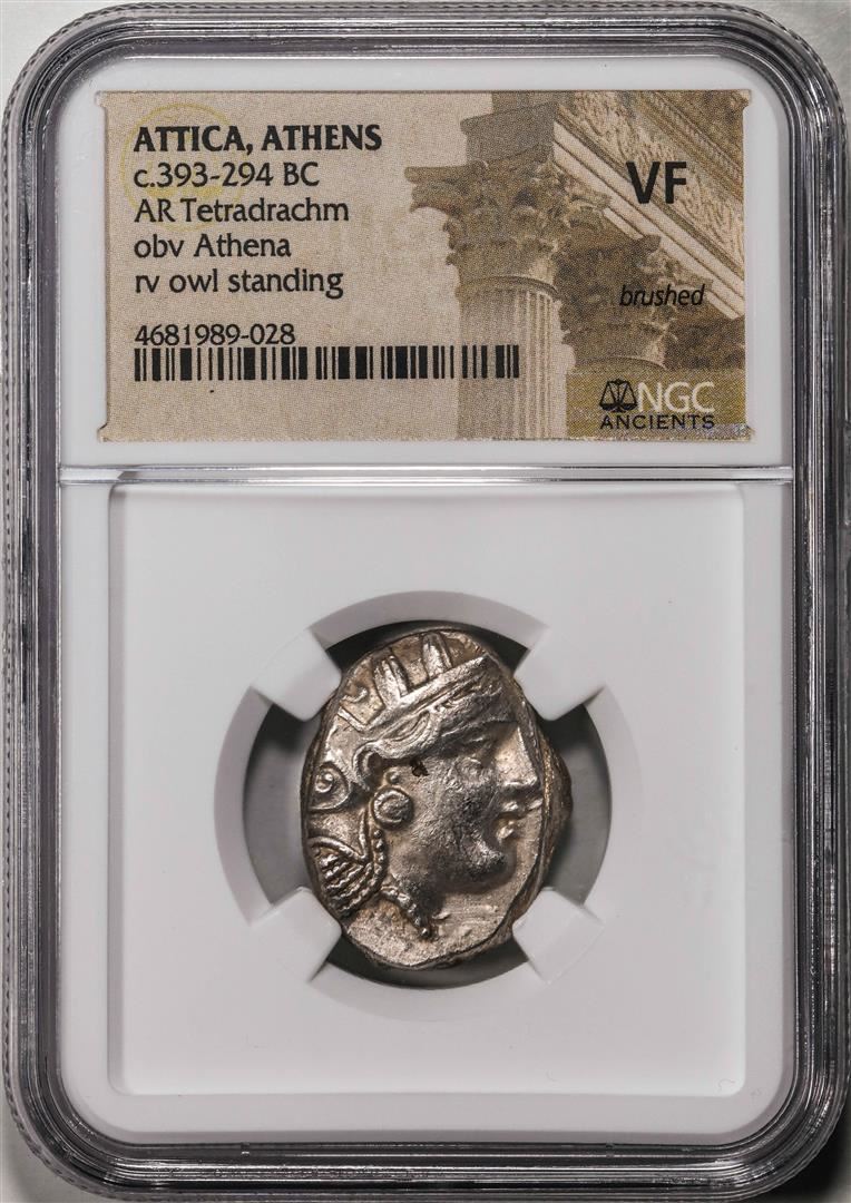 One c.393-294 BC Attica Athens AR Tetradrachm Athena Owl Ancient Coin NGC VF. NGC Certified.