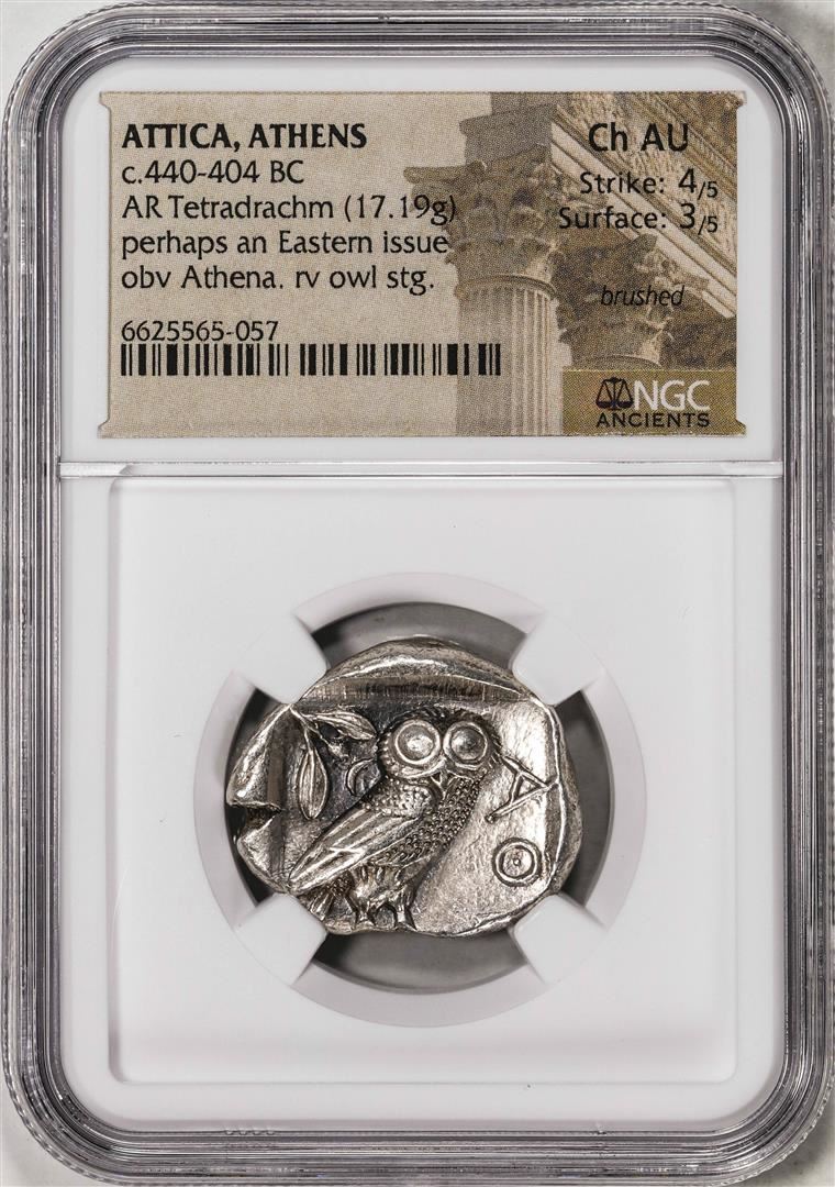 One c.440-404 BC Attica Athens AR Tetradrachm Athena Owl Ancient Coin NGC Ch AU. NGC Certified.