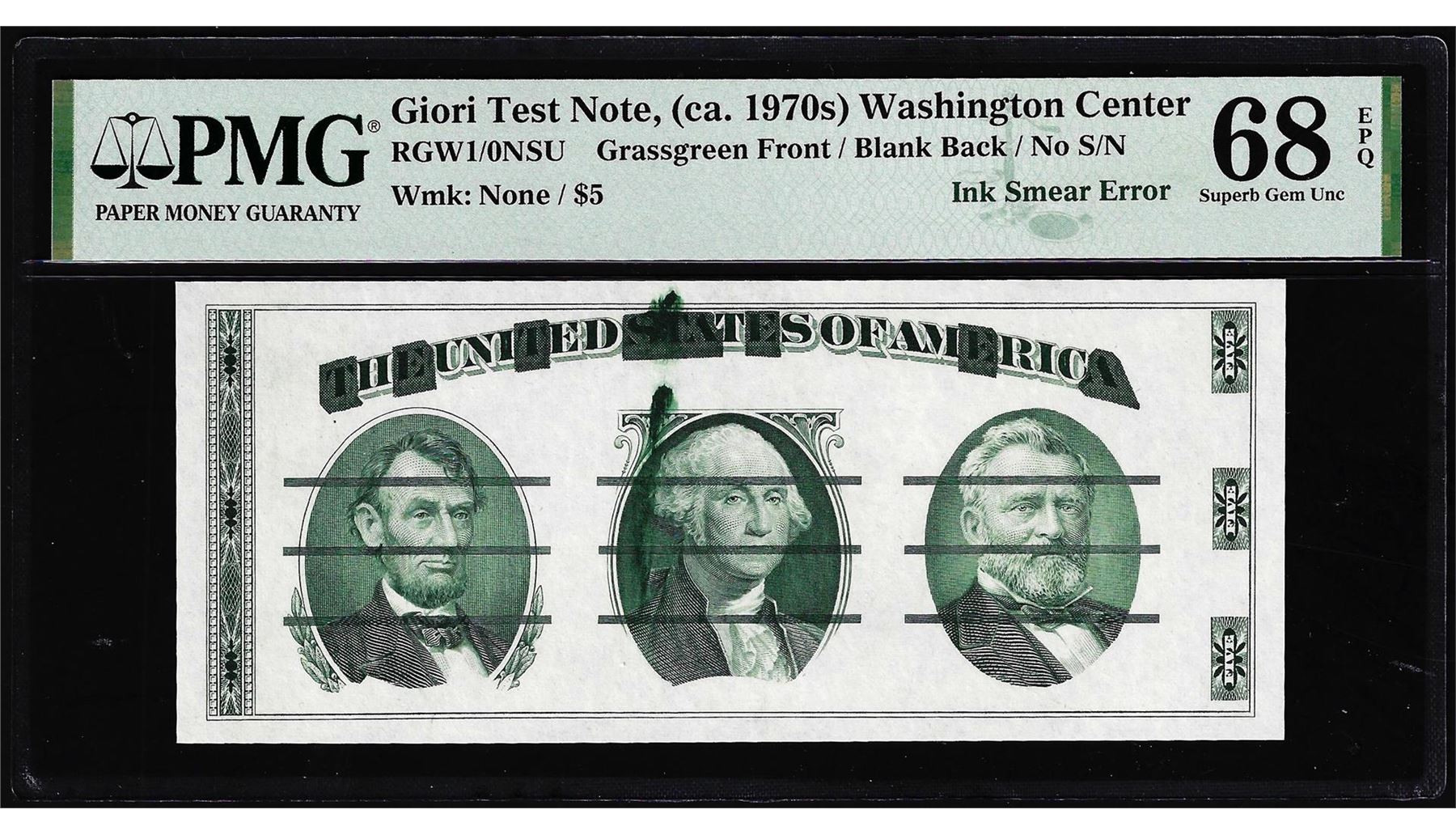 ca. 1970's Washington Center Giori Test Ink Smear Error Note PMG Superb Gem Unc. 68EPQ