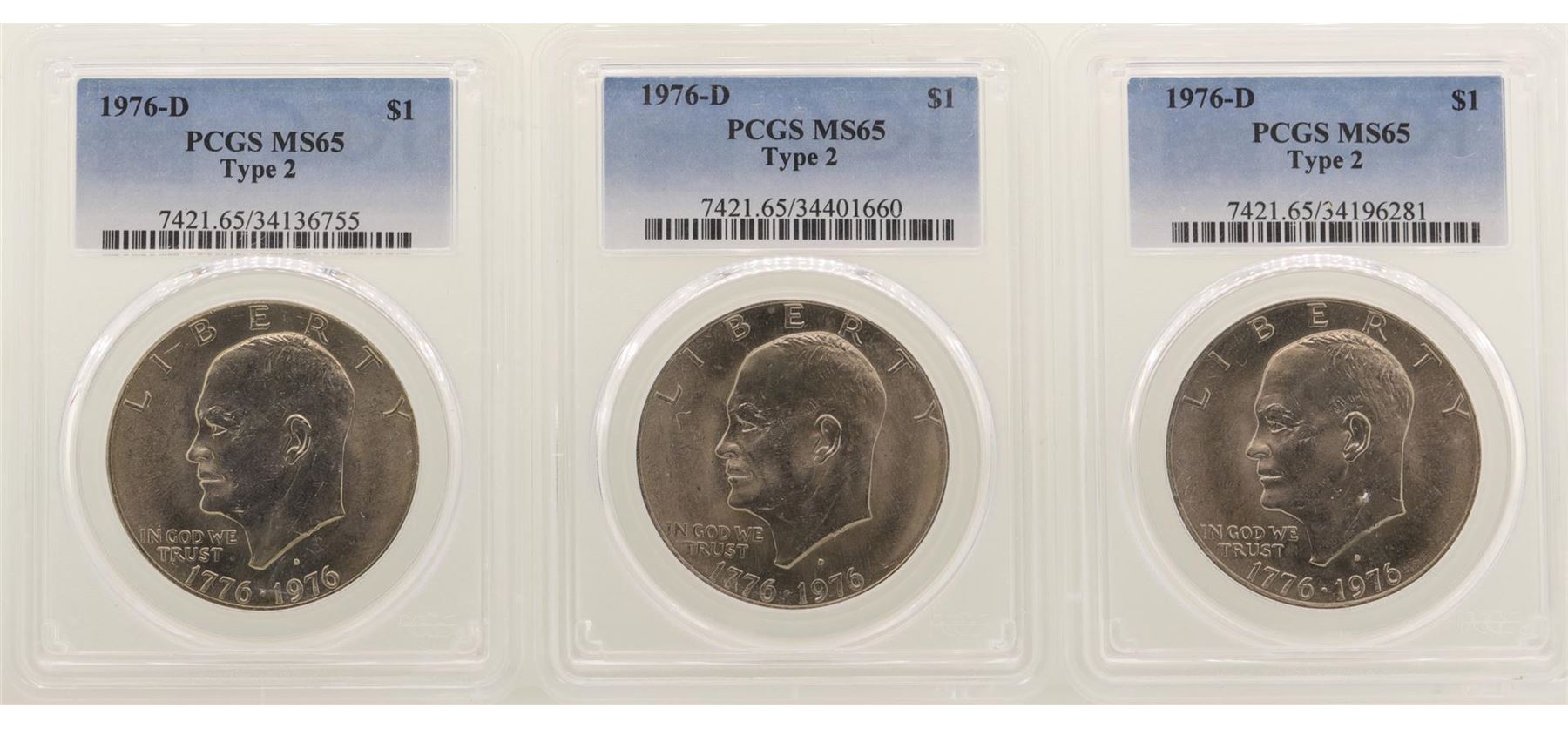lot of (3) 1976-D Type 3 Eisenhower Dollar Coins PCGS MS65 Type 2